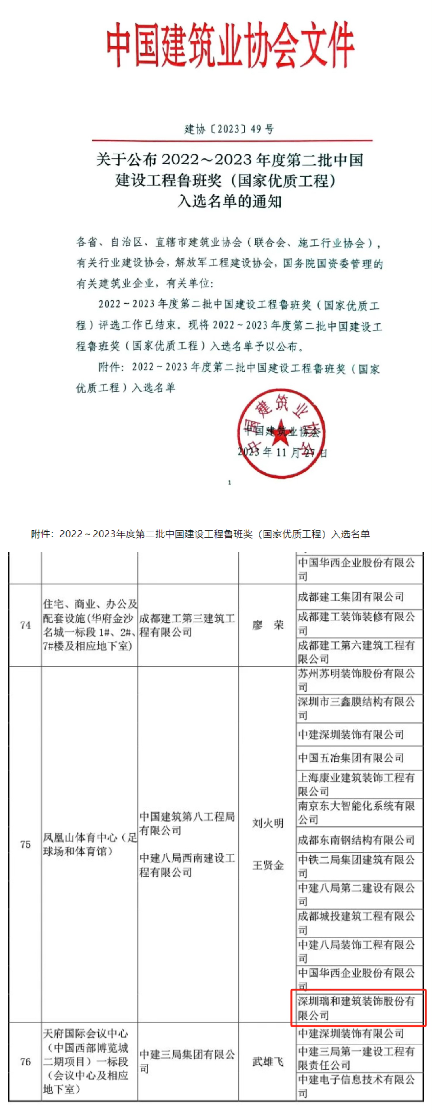 11月27日,中國建筑業協會公布了2022~2023年度第二批中國建設工程魯班獎(國家優質工程)獲獎工程名單,深圳瑞和建筑裝飾股份有限公司(股票代碼:002620 股票簡稱:瑞和股份)參建的鳳凰山體育中心入選榜單,榮獲中國建設工程魯班獎。瑞和股份魯班“小金人”再+1!